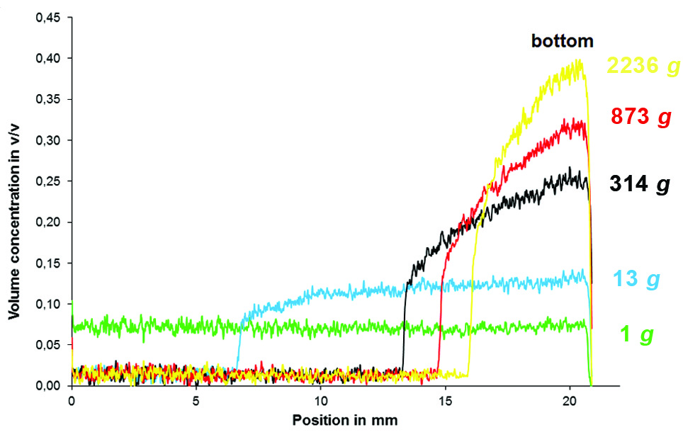 More than 1,600 detectors record the transmitted beam, giving an unprecedented resolution over the entire sample cell of 20 mm height. Kinetics of instantaneous recorded transmission profiles across your whole sample are converted into stability and separation rates. Particle concentration, sediment packing density and X-ray attenuation can also be calculated based on the extinction profiles.